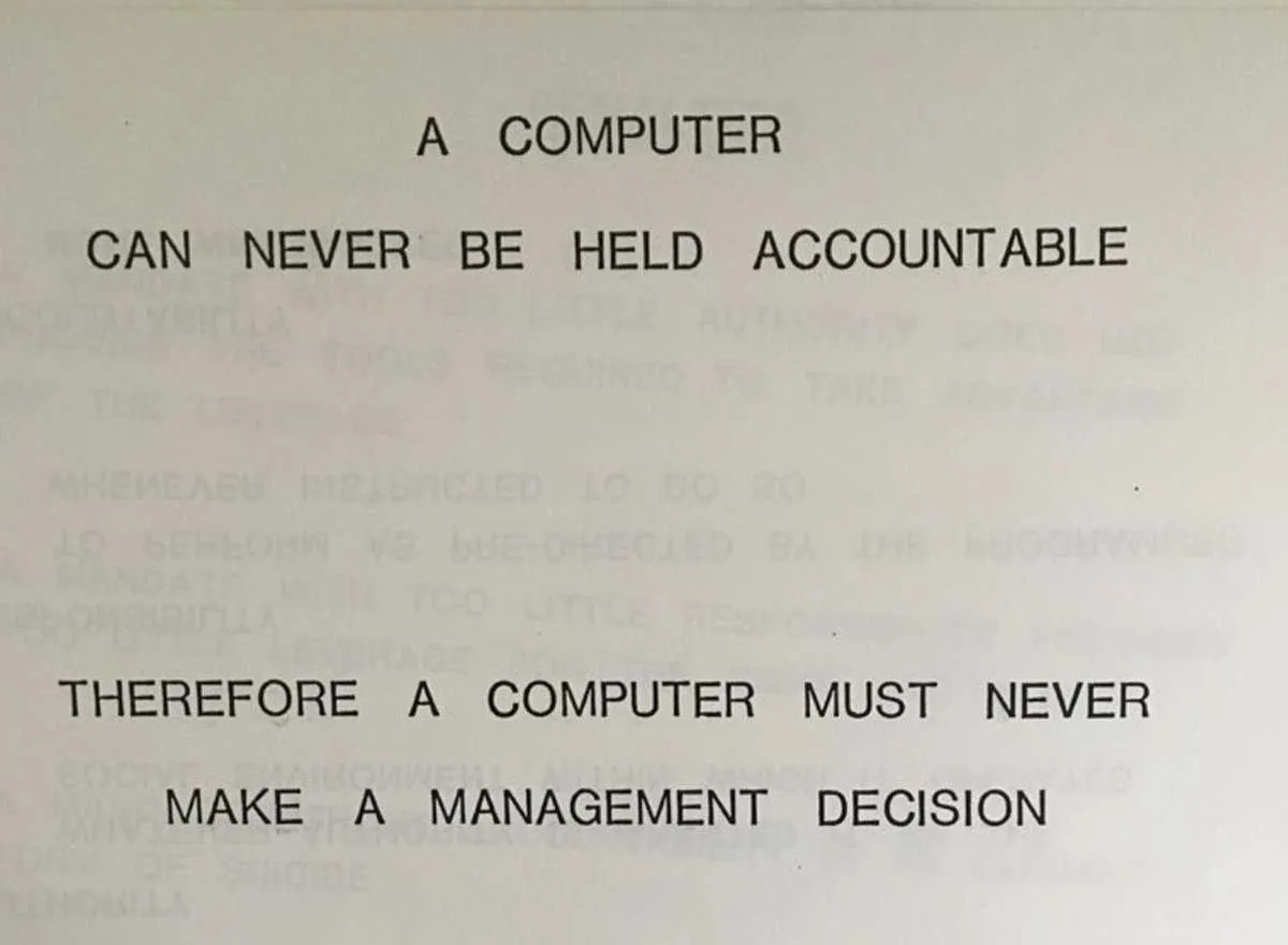La imagen se cita como extraída de un manual de entrenamiento de 1979 de IBM, aunque no hay evidencia fuerte: https://simonwillison.net/2025/Feb/3/a-computer-can-never-be-held-accountable/ ↩